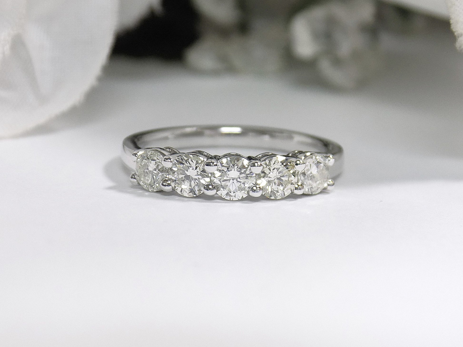 The traditional 5-stone diamond anniversary band with 5 x .20ct natural round brilliant diamonds set in a shared prong 14K white gold mounting. Great for wearing by itself or with an engagement ring or solitaire.