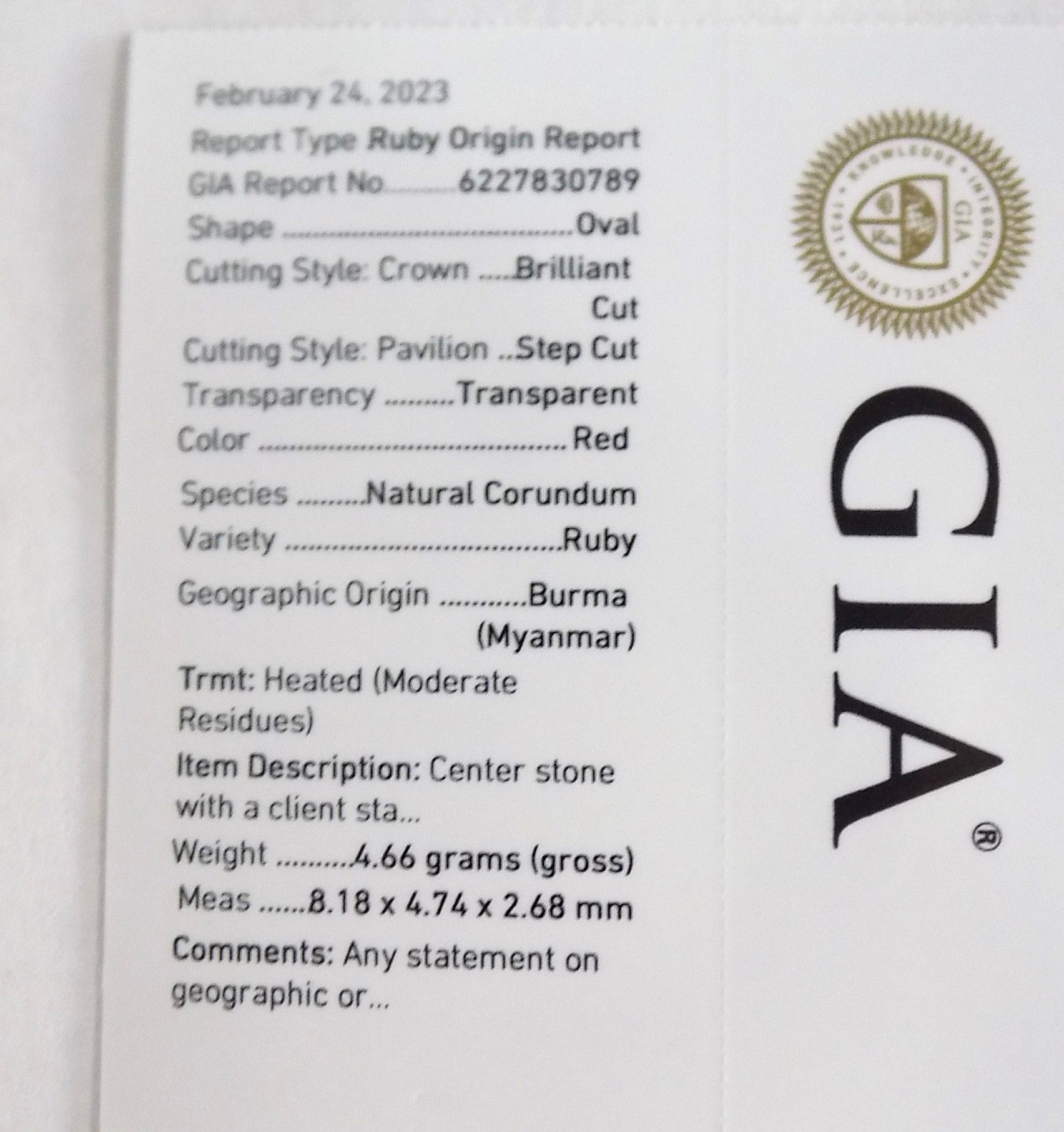 - Primary Gemstone: 1.04ct Faceted Oval Natural Certified Burmese Ruby - Pigeon Blood Red - Very Rare