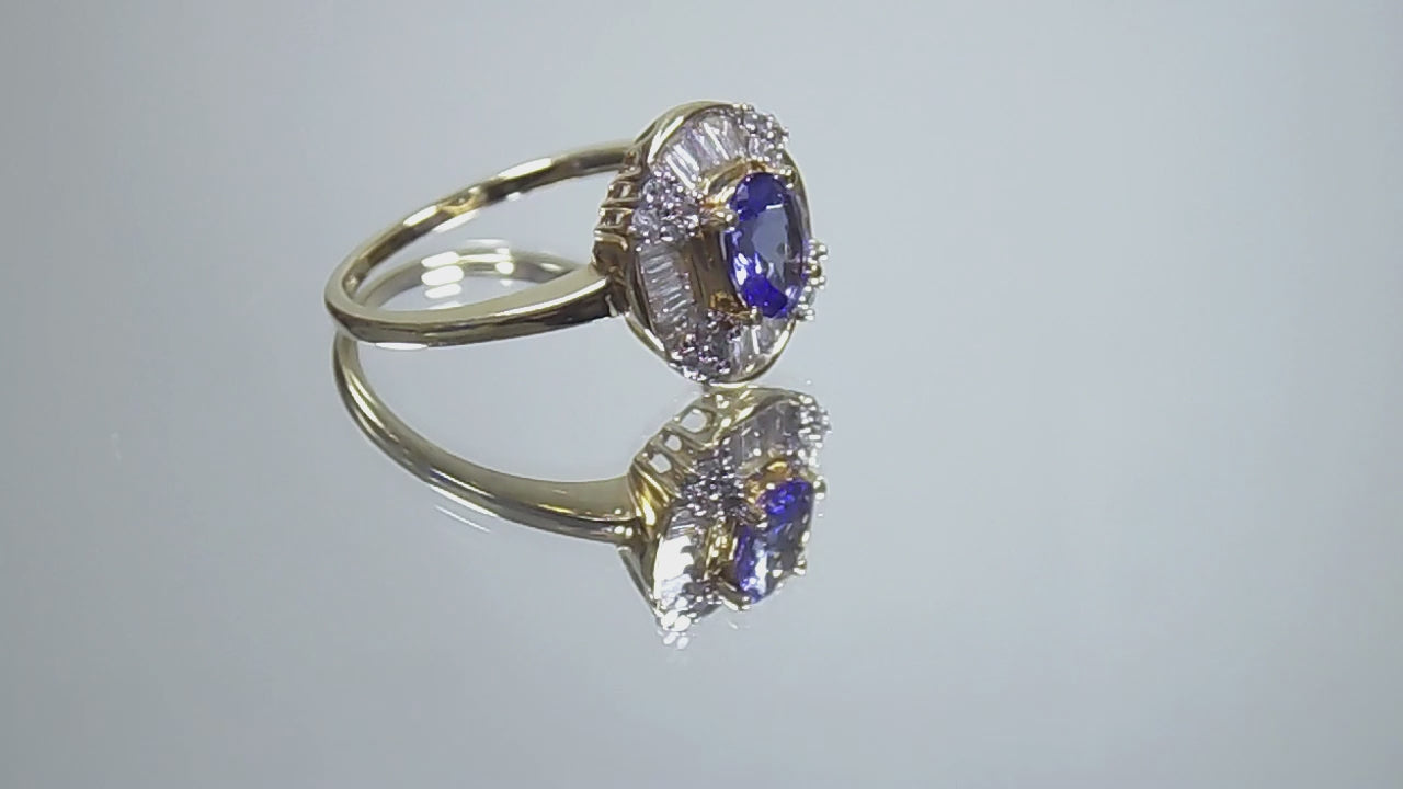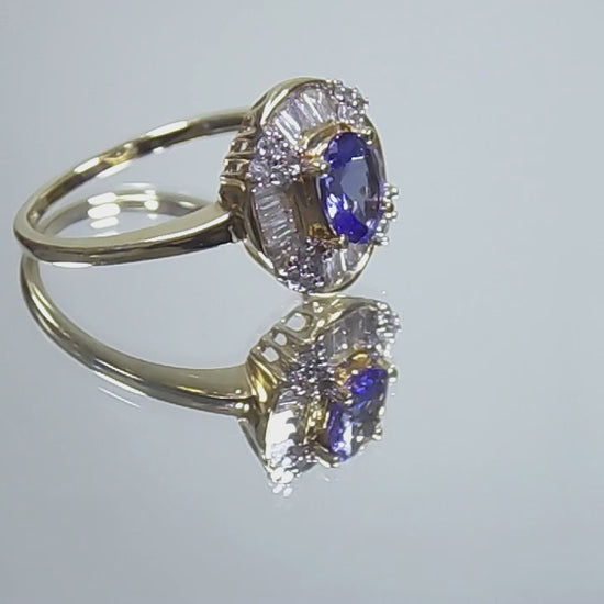This Natural Tanzanite & Diamond Estate Ring features a 1ct Genuine Oval Shape Tanzanite surrounded by .50ct in natural baguette and round diamond accents. The completed gemstone weight of the ring is 1.50ct total and is set in 14K Yellow Gold. This ring has been fully restored to Like New condition!