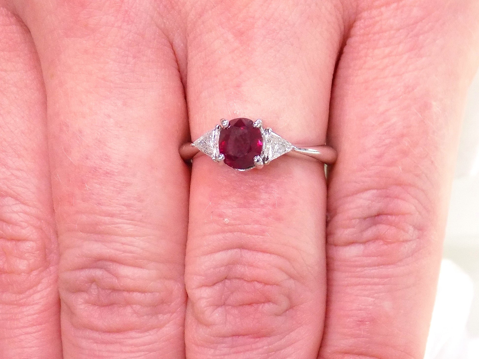 1.51ct Vintage Genuine High Quality Natural Pigeon Blood Oval Shape Ruby with a Natural Trillion Shape Diamond on Either Sider in Platinum