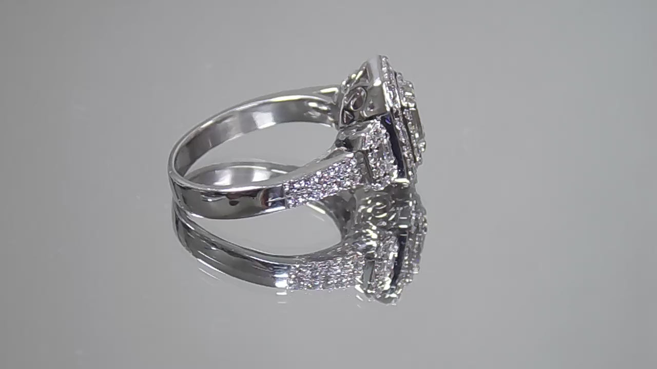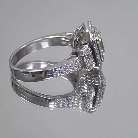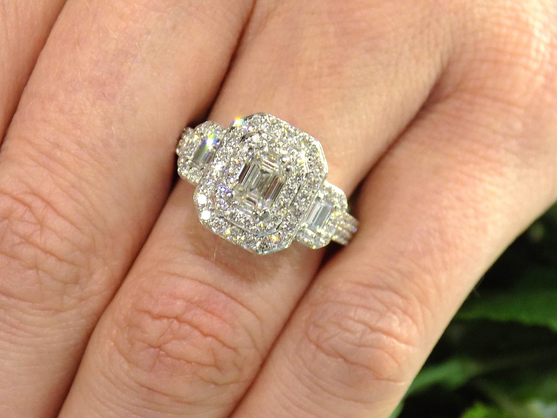 This very well made 3-Stone version of the halo style ring flaunts a Natural .70ct Emerald Cut diamond in the center surrounded by a double halo of round diamond accents and two more emerald cuts on either side. The total diamond weight of the ring is 1.56ct set in .900 Platinum. It's a low profile and Victorian look make this ring really stand out.