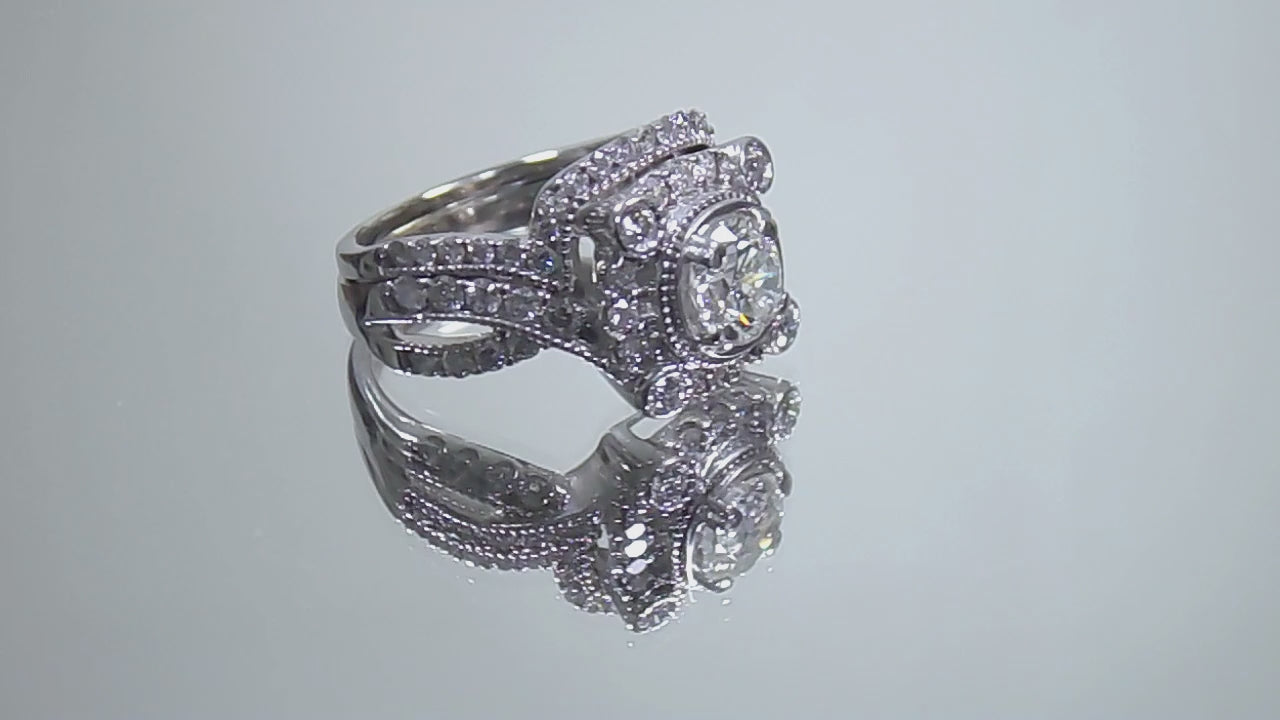 This 2-Piece Estate Bridal Set is Already Tacked Together as One Ring. It features a natural .95ct (1ct) round brilliant center diamond and 1.00ct in round diamond accents around the center and down both bands in Solid 14K White Gold. The set if fully restored to Like New condition - except we left the 2-piece tacked together as one ring.