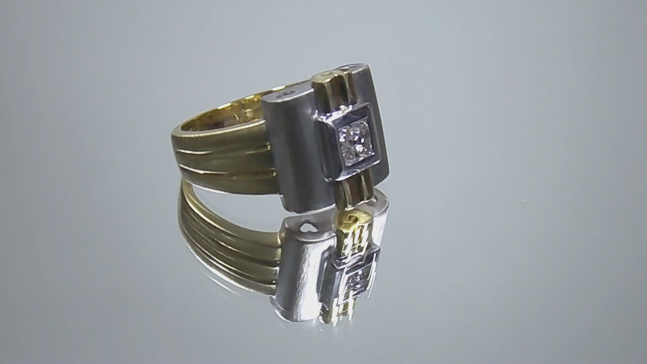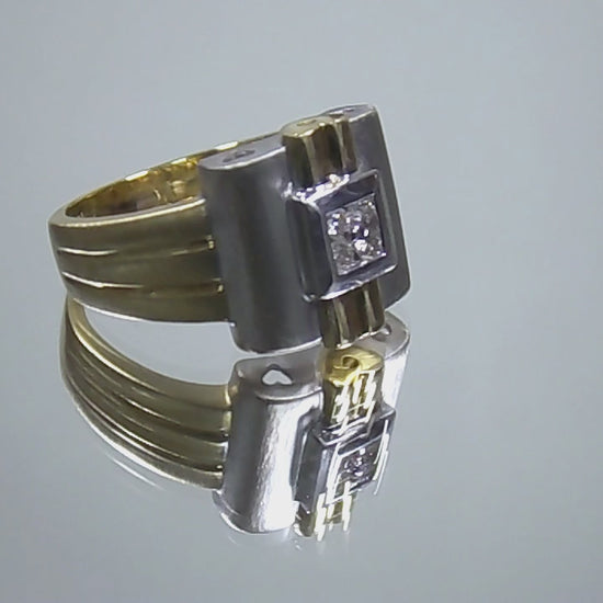 This ring is from the Retro Era (circa 1950's) featuring a two-tone brushed 18K gold band and a prominent central diamond section in the center. It's inspired by the Art Deco period, known for it's geometric architectural designs. The ring has 4 natural round diamonds set to look like a square in the center for a total diamond weight of .20cts. It's a nice and heavy mounting, very well-made and fully restored.