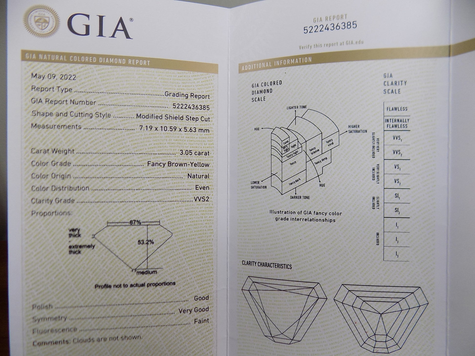 - Center Diamond: Natural Fancy Chocolate 3.05ct Shield Cut, VVS2 Clarity - GIA cert seen in photos