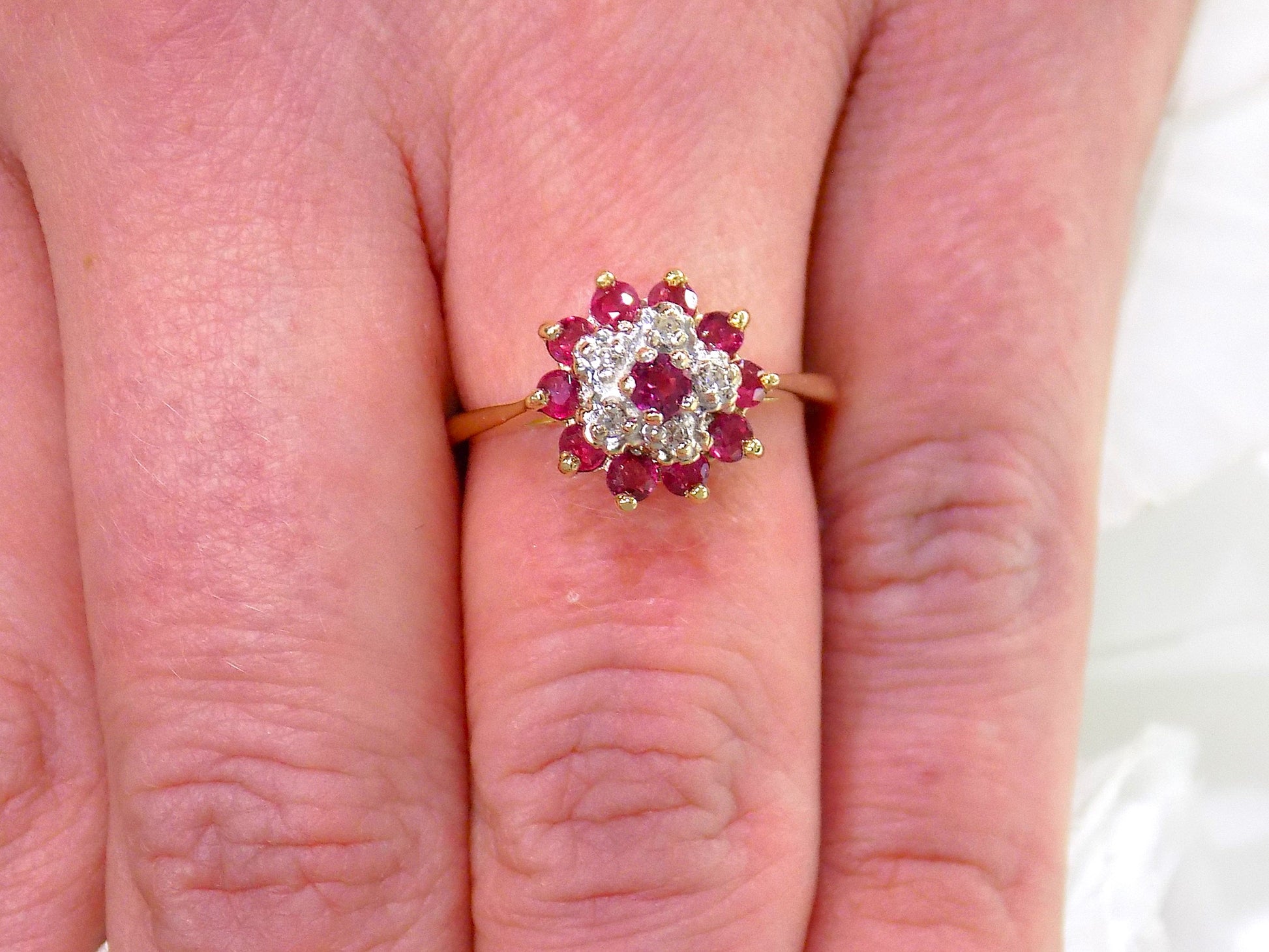 The Genuine Round Ruby & Diamond Cluster or Cocktail Ring in 14K Yellow Gold is from our Estate Collection. It features one natural ruby in the center, surrounded by 5 small genuine diamond accents and 10 natural round rubies around the outside for a completed gemstone weight of .50ct total. Fully Restored to Like New Condition