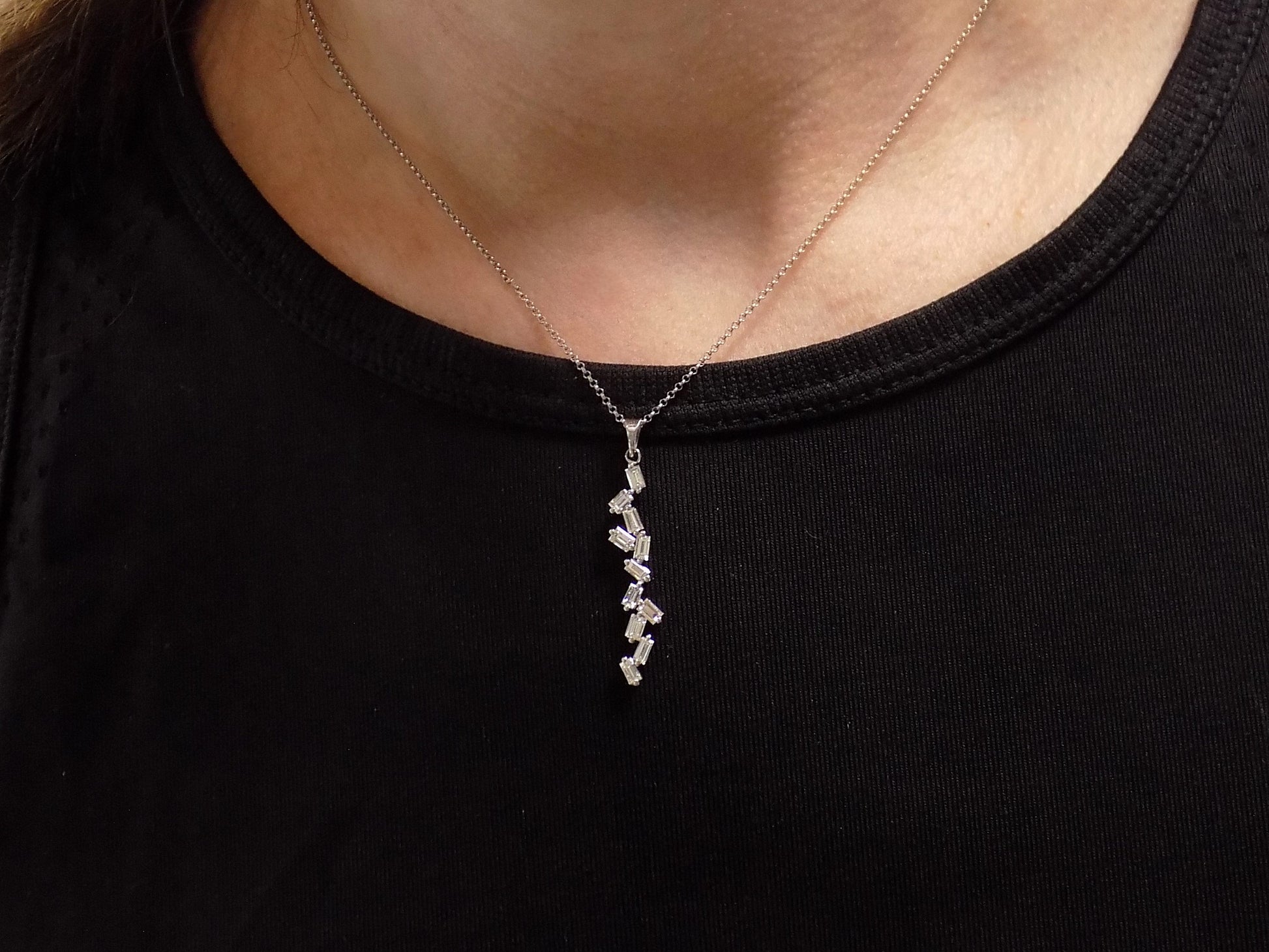 This unique one-of-a-kind natural diamond pendant or necklace is set 18K white gold with an adjustable style cable chain that can by worn as at 12", 14", or 16". It has a completed diamond weight of .91ct in all natural Baguette Diamonds. It hangs 35mm long (or 1.4").