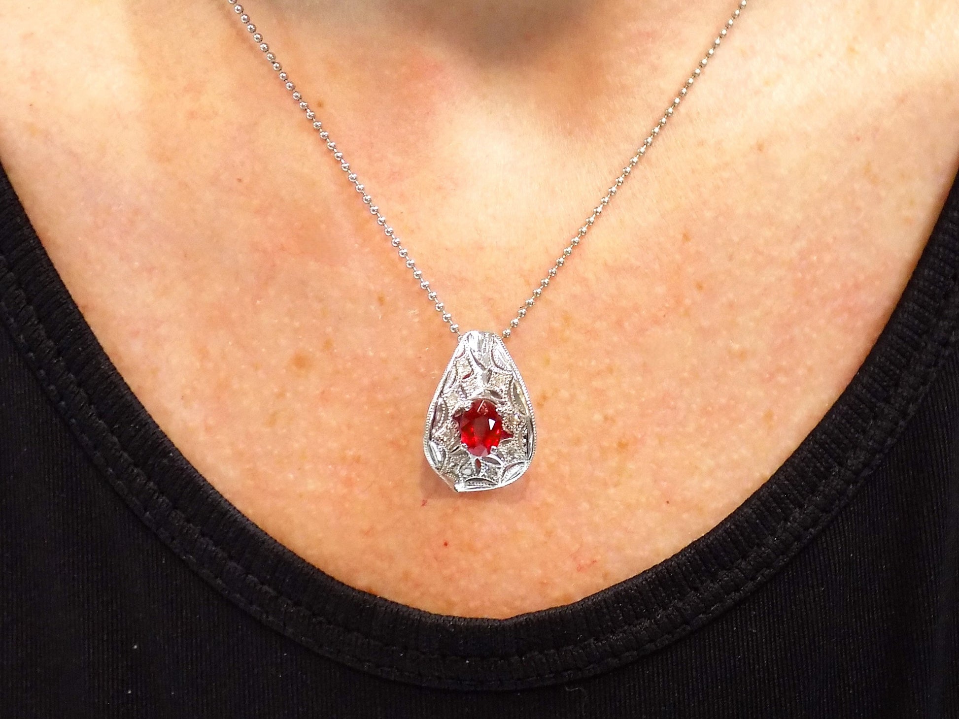 Gorgeous Vintage Victorian Style Ruby & Diamond Pendant / Necklace in Platinum. The center Natural High-End Oval Ruby (pigeon blood) weighs 1.05ct with a total of .15ct in Natural Round Diamond Accents. The completed gemstone weight of the pendant / necklace is 1.20ct total. It's hard to narrow down the exact age of the piece, but it's believed to from the 1960's to the 1970's. The chain is also platinum and is 16" long. It's in Like NEW Condition!