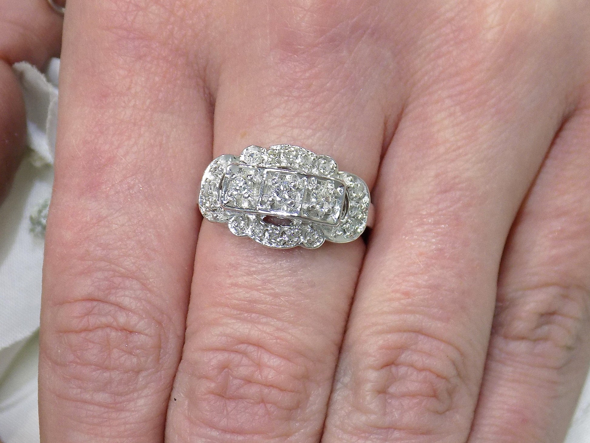 Vintage Traditional Variation of the Princess Style Diamond Ring in a Heavy 14K White Gold Mounting. The ring features 3 primary diamonds in the center with a ring of diamonds encircling them for a completed diamond weight of .25ct total (looks like much more than that). It's very well made, heavy, Victorian looking and in Like New condition. The origins are likely between 1960 and 1975.
