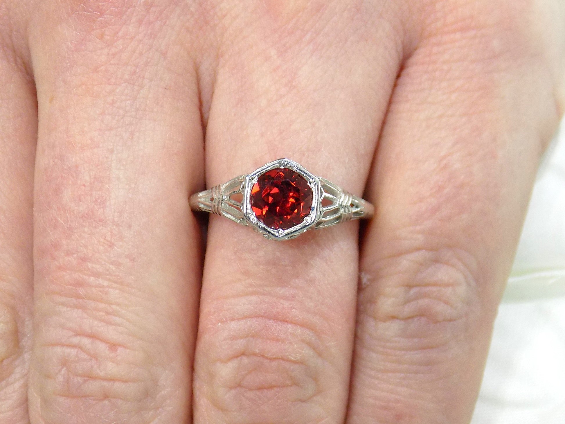 Women's 1.00ct Filigree Style Natural Round Garnet Solitaire in 10K White Gold - Victorian Look