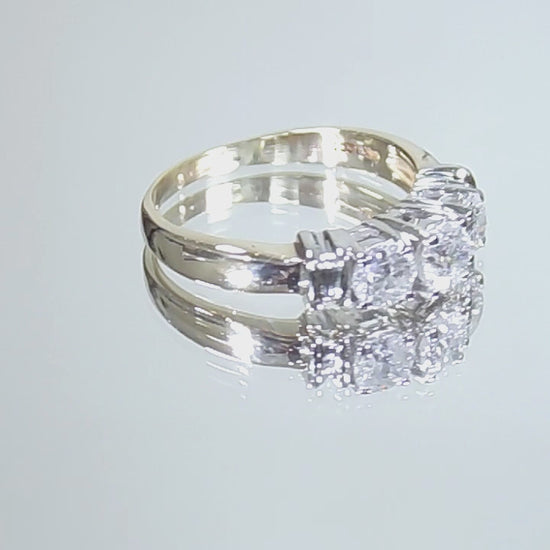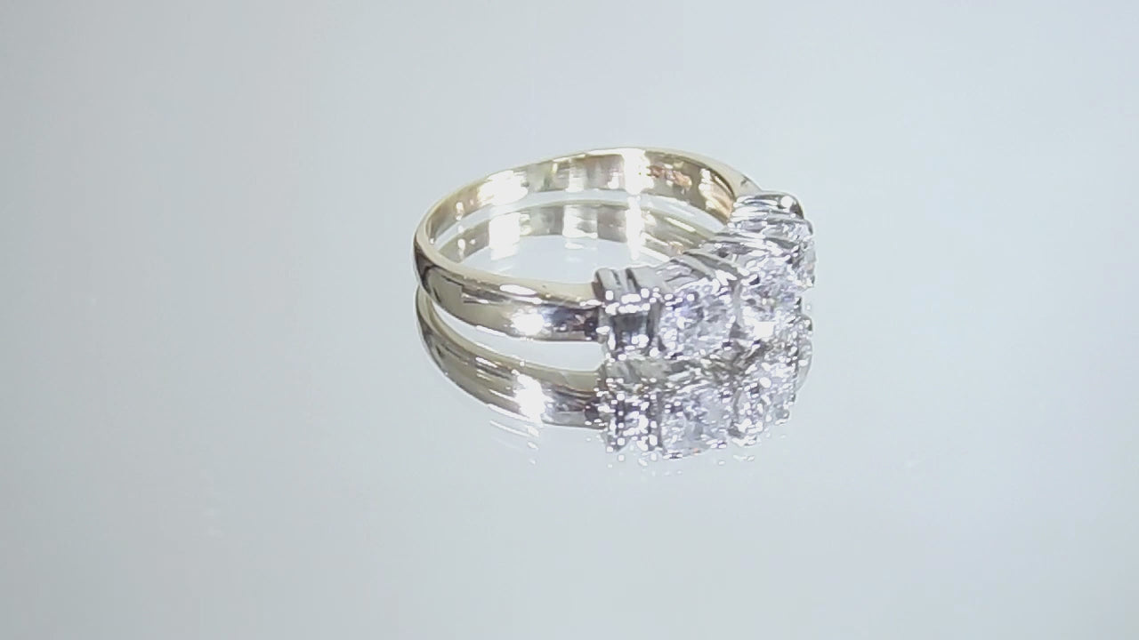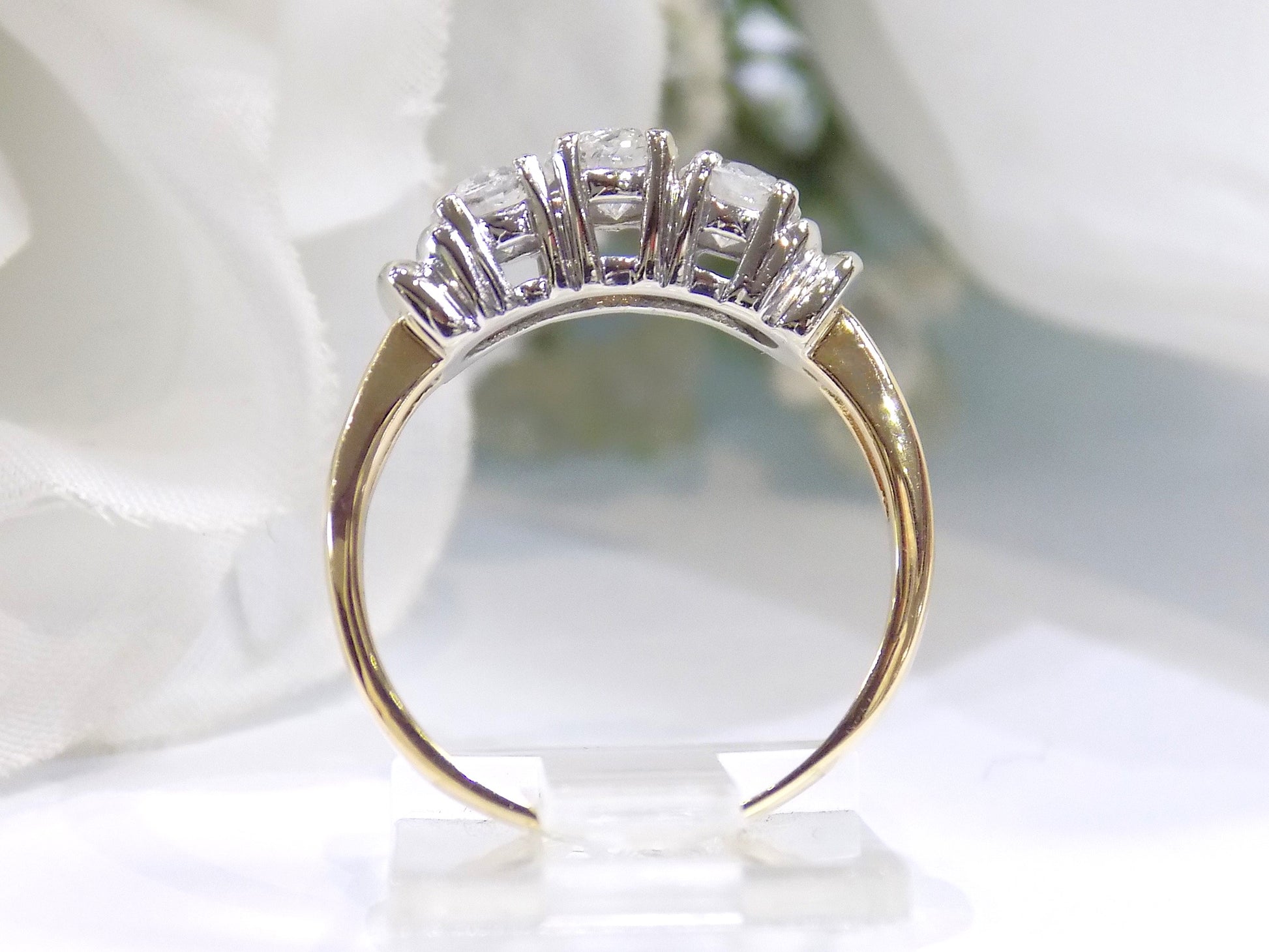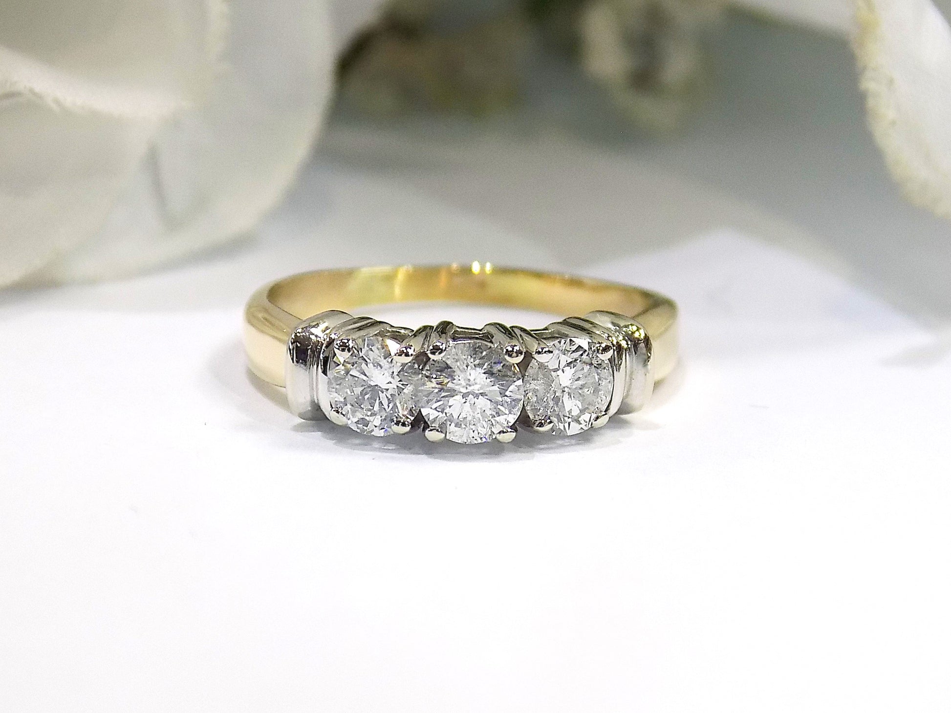 Very Traditional Classic! The 3-Stone Style Natural Diamond Ring Has a 14K Yellow Gold Band with 14K White Gold Accents and Prongs - so it's 2-Tone Yellow/White Gold. It features 3 x .33ct Natural Round Brilliant Diamonds for a completed diamond weight of 1.00ct total! It's sometimes called a Past, Present & Future Ring.