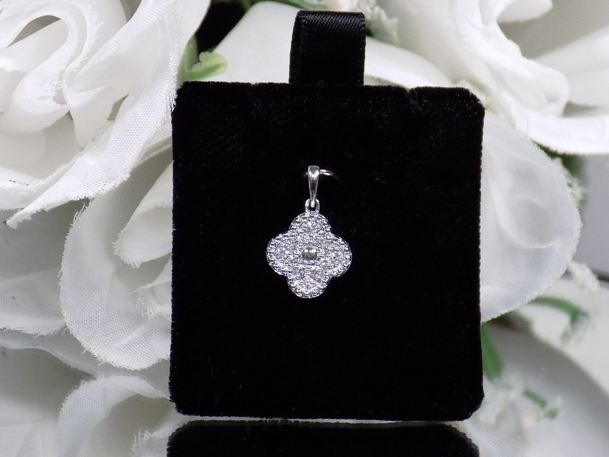 This style looks very much like the Brand Van Cleef's New Clover Design. It has .20ct total natural diamond weight set in solid 10K white gold. Also Available in Yellow Gold. *Chain is not included