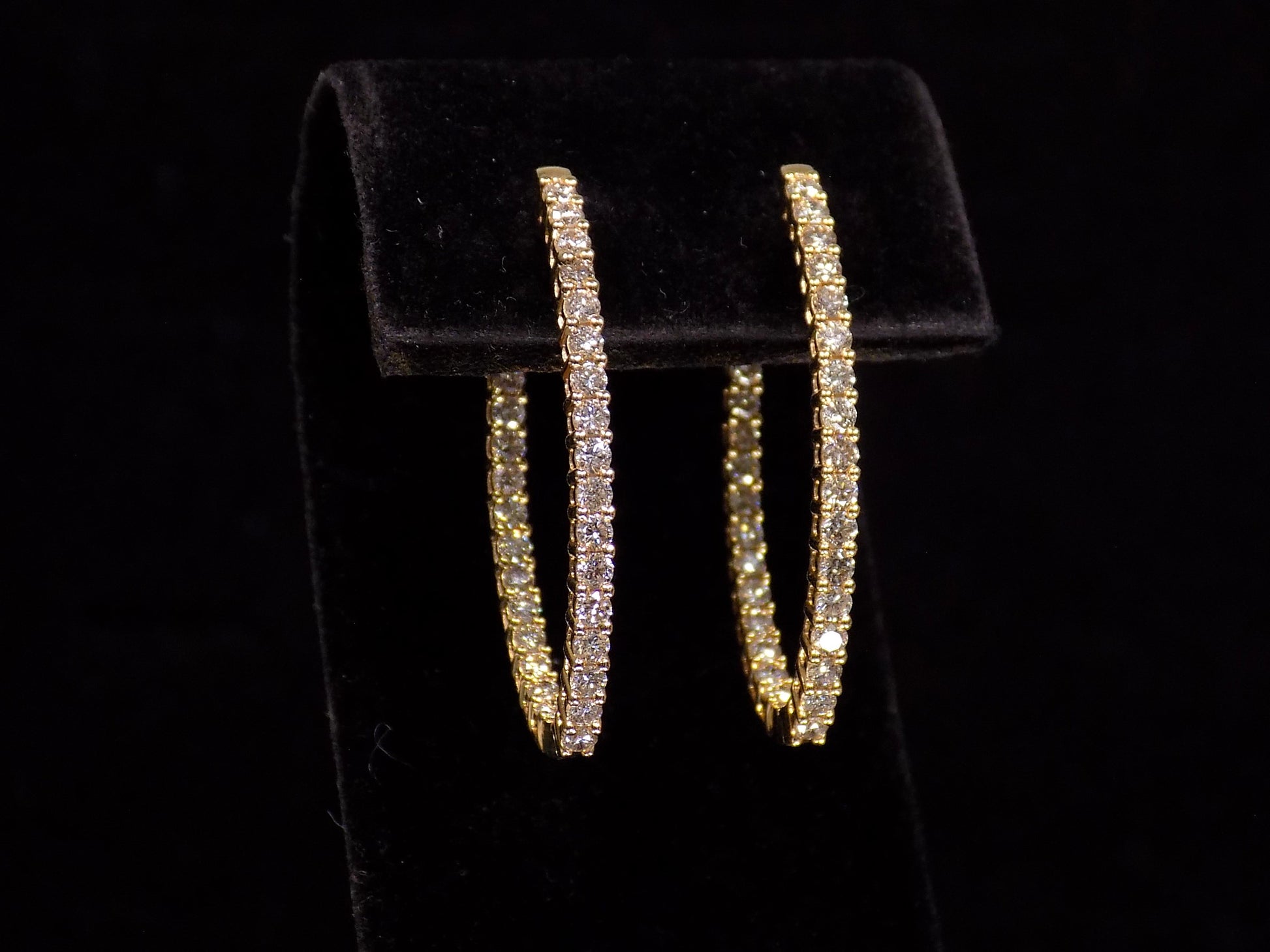 These Oval Shape inside-out style natural diamond hoop earrings measure 1.3" in length (or 33.6mm). They weigh 2.00cts total weight in natural round brilliant diamonds and set in solid 14K white gold. They have the very best press and release clasps we've ever seen - very reliable. (Also available in White Gold Here.)