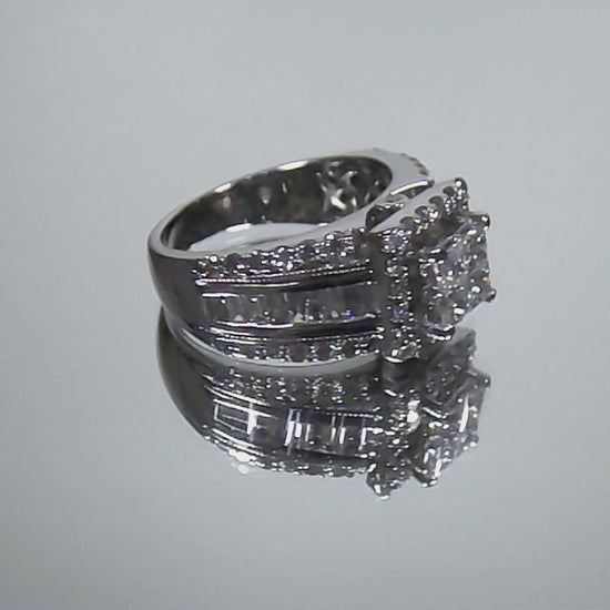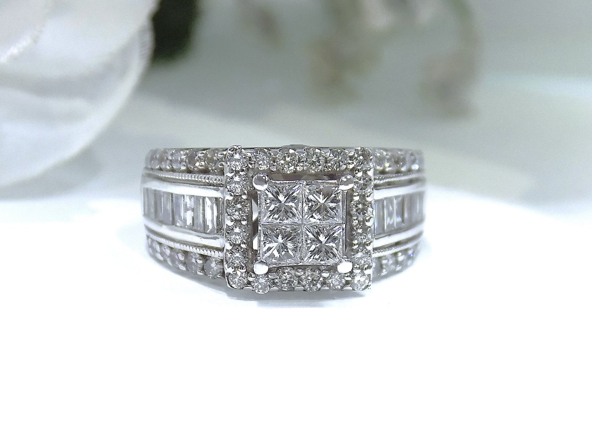 This whopping 2ct Total Weight Ring works great for an Engagement Ring OR a Right Hand Ring. The ring features 4 natural princess cut diamonds in the center called a Quad - which makes it look like the center is one larger princess cut diamond, this is surrounded by natural round brilliant diamond accents and channel set natural baguette diamonds down each side. Overall a Very Heavy & Impressive Ring!