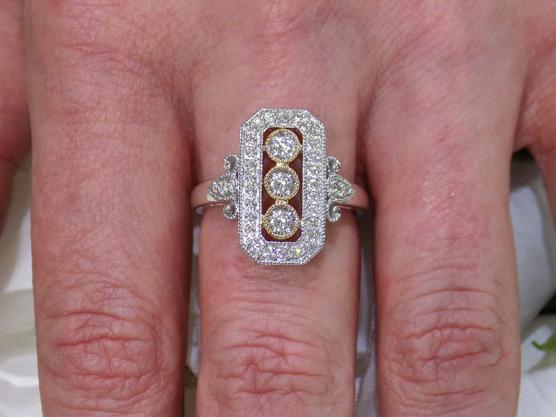 Very pretty and unique filigree style natural diamond ring in solid 10K white & yellow 2-Tone gold. The completed diamond weight of the ring is .37ct total. It has a very low profile so it would be perfect for anyone in the health care industry or wears gloves on a regular basis.