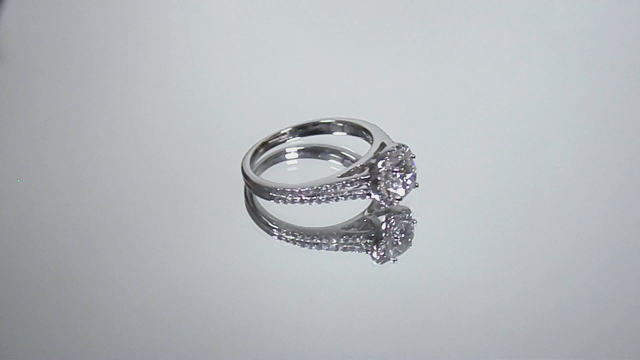 Very Popular High Quality Natural Round Diamond Halo with a Split Shank in 14K White Gold. This ring features a .53ct Natural Round Brilliant Diamond in the Center with a total of .22ct in Natural Round Diamond Accents for a completed diamond weight of .75ct total!